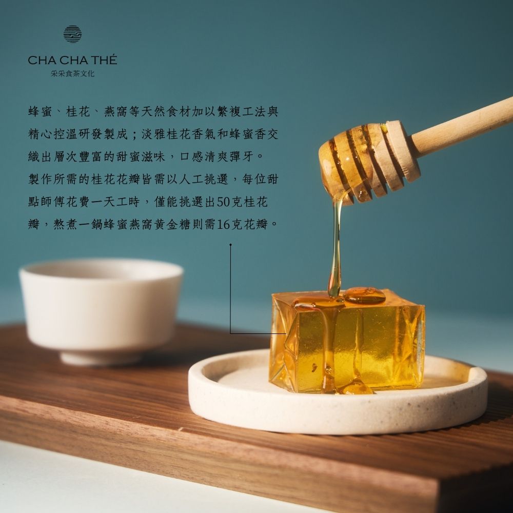 燕窩的溫潤與蜂蜜的甜美,在淡雅桂花香氣中緩緩化開。這款歷經精心控溫與繁複工法的獨門茶點,以清爽彈牙的獨特口感,為您呈獻最極致的匠心之作。
