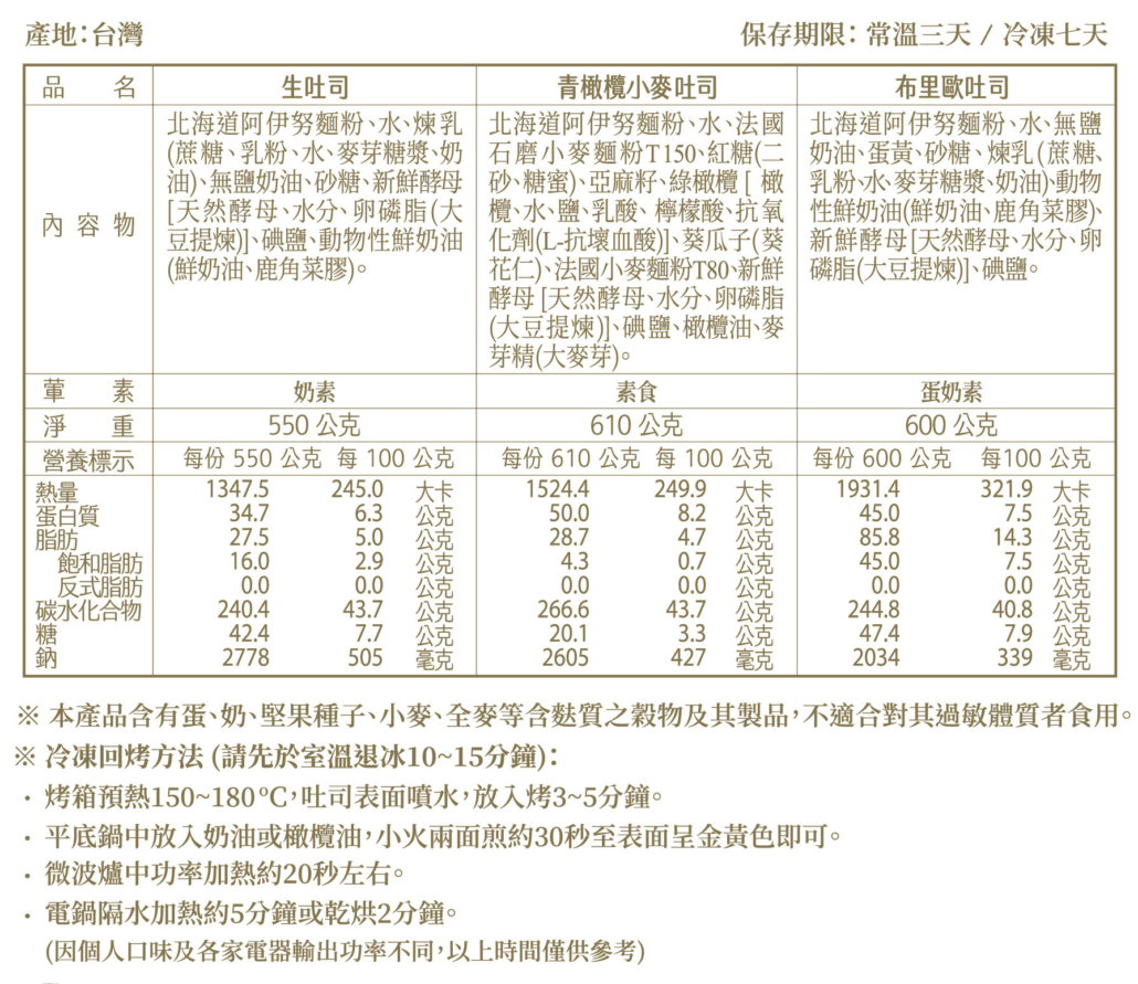 • 週二至週四出貨,吐司單獨出貨,恕無法與其他商品合併配送
